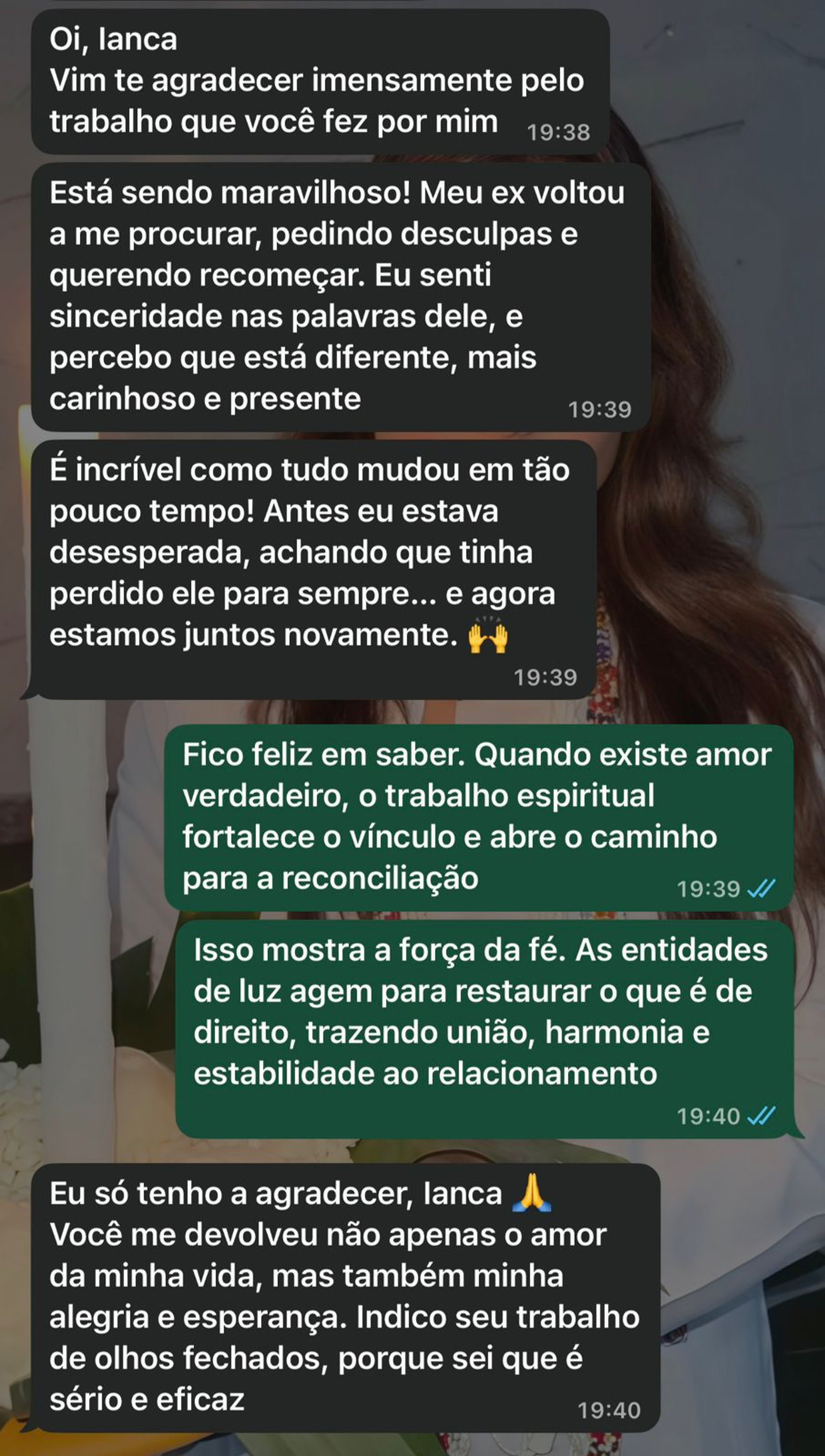 Não permita que a solidão, a perda ou a distância continuem trazendo dor ao seu coração. Com a orientação e auxílio da Espiritualista Taróloga Ianca você pode reconquistar, unir e viver intensamente o amor pleno e verdadeiro que você merece.